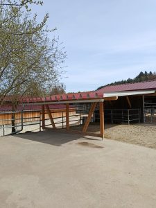 So auch bezüglich der wichtigen Fellpflege, für welche ein trockener Sandbereich unerlässlich ist. Damit ein solcher auch den Eselstuten bei jeder Witterung und Jahreszeit zur Verfügung steht, ging es daher an die Planung der Überdachung des vorhandenen Sandplatzes.
